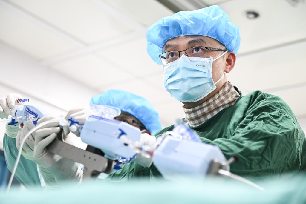2月20日,在南京市第一醫(yī)院,張俊杰和團(tuán)隊(duì)在心導(dǎo)管室為患者進(jìn)行經(jīng)導(dǎo)管二尖瓣緣對(duì)緣修復(fù)手術(shù)。(新華社記者 季春鵬 攝)