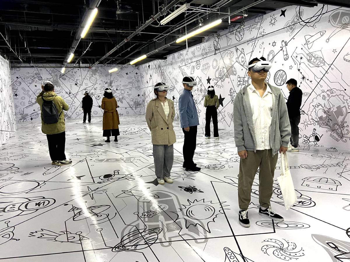 3月27日,在北京市石景山區(qū)首鋼園的沉浸式科幻空間展廳,參觀者戴上頭顯裝置,體驗遙在(山東)數(shù)字科技有限公司打造的星際奇航旅程體驗項目。(圖片來源:新華社)