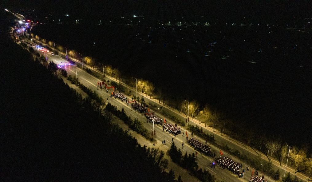 4月3日凌晨,參加徒步祭英烈活動的師生從固原市城區(qū)出發(fā),前往位于彭陽縣的任山河烈士陵園祭奠英烈(無人機照片)。