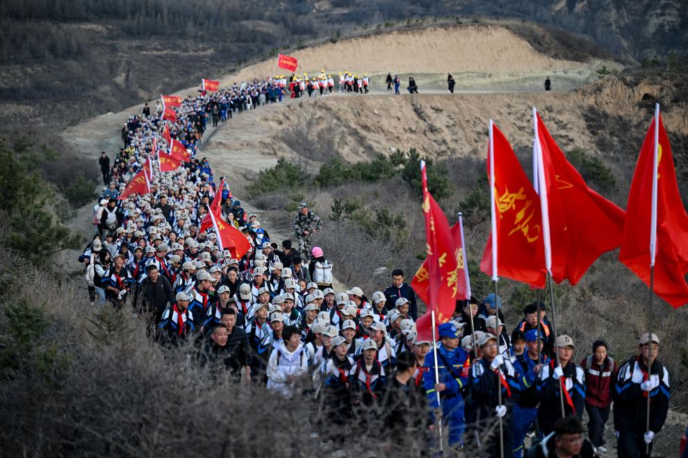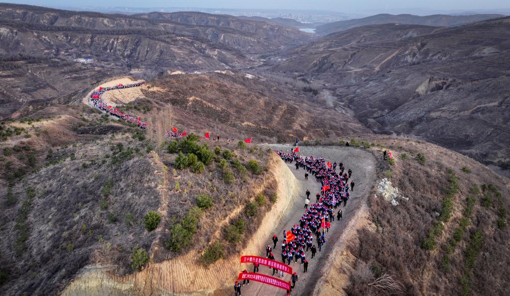 4月3日,參加徒步祭英烈活動的師生在翻越黃峁山(無人機照片)。