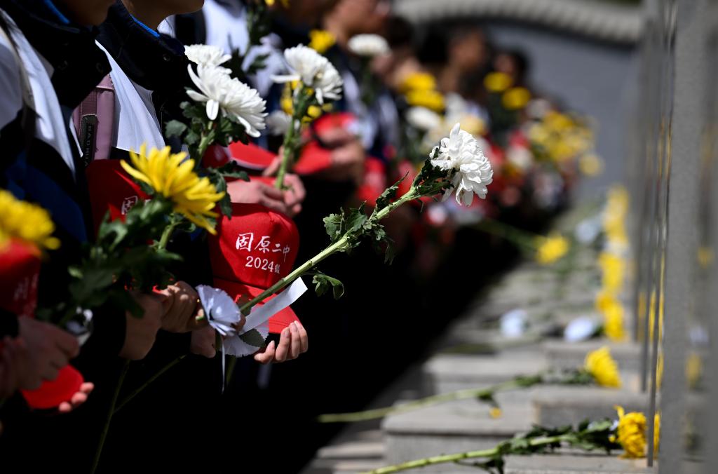4月3日,在任山河烈士陵園,固原二中學(xué)生向烈士墓碑獻花。