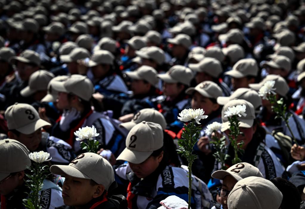 4月3日,抵達任山河烈士陵園的學(xué)生們手持白菊原地休整。