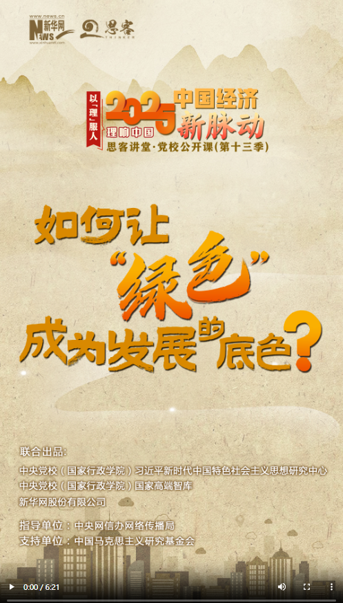 新一季“思客講堂·黨校公開課”《理響中國·以理服人|2025中國經(jīng)濟(jì)新脈動》,帶你讀懂2025年經(jīng)濟(jì)工作重點(diǎn)。藍(lán)天、碧水、凈土;節(jié)能、減排、降碳;生態(tài)優(yōu)先、綠色消費(fèi)、零碳工廠……一個(gè)個(gè)生動的綠色畫筆,勾勒出高質(zhì)量發(fā)展的底色。綠色打底,發(fā)展更優(yōu)。怎么讓“綠色”成為發(fā)展的底色?如何激活全面綠色轉(zhuǎn)型的潛力?中央黨校(國家行政學(xué)院)社會和生態(tài)文明教研部副教授韓融給出了答案。
