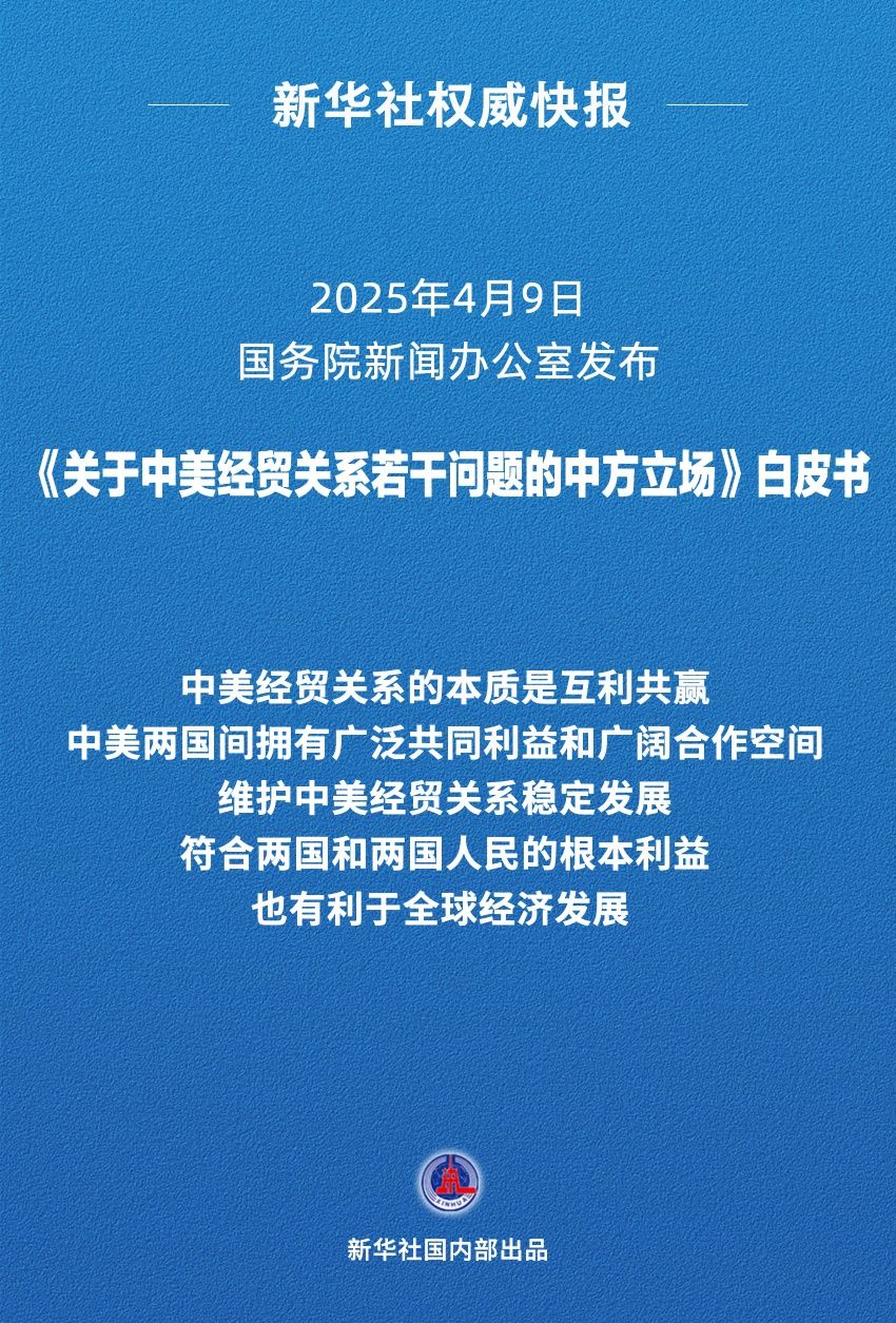國務(wù)院新聞辦公室4月9日發(fā)布《關(guān)于中美經(jīng)貿(mào)關(guān)系若干問題的中方立場》白皮書,澄清中美經(jīng)貿(mào)關(guān)系事實,闡明中方對相關(guān)問題的政策立場。