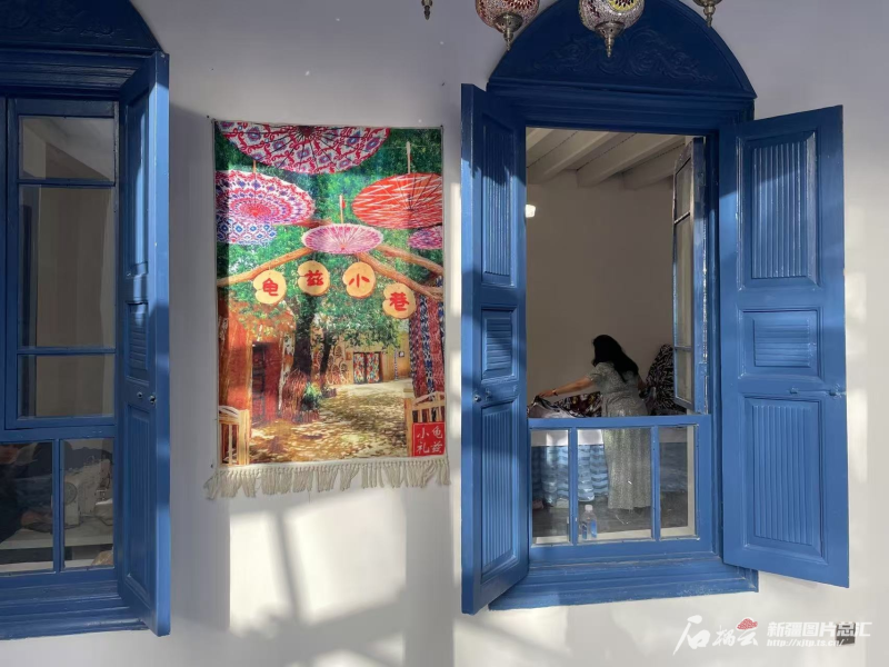 修舊如舊,喚醒了老街巷?,F(xiàn)在,這里有當(dāng)?shù)鼐用耖_的茶館和馕鋪,也有外地人經(jīng)營(yíng)的咖啡館和旅拍店、服裝店。斑駁的土墻與雕花的木門間,墻上懸掛的各色瓷盤、托盤,無聲訴說著歲月的變遷。2024年,這里接待游客90萬人次,成為庫車市文旅新地標(biāo)。
