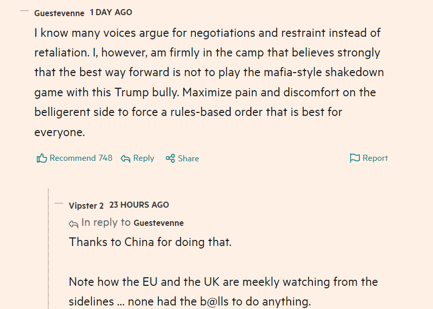 中國(guó)的嚴(yán)正立場(chǎng)也引發(fā)了同樣受到美國(guó)關(guān)稅影響的各國(guó)網(wǎng)民對(duì)中國(guó)的廣泛支持。在英國(guó)《金融時(shí)報(bào)》相關(guān)報(bào)道評(píng)論區(qū),獲贊最多的一條網(wǎng)友評(píng)論稱:“我知道有許多聲音主張通過(guò)談判和克制來(lái)解決問(wèn)題,而不是采取反制行動(dòng)。然而,我強(qiáng)烈認(rèn)為最好的前進(jìn)方式就是將好戰(zhàn)一方的痛苦和不適最大化,如此才能建立一個(gè)對(duì)所有人都有利的基于規(guī)則的秩序?!?/p>