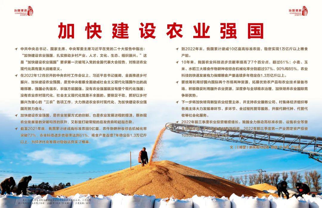 ◆ 中共中央總書記、國家主席、中央軍委主席習(xí)近平在黨的二十大報(bào)告中指出:“加快建設(shè)農(nóng)業(yè)強(qiáng)國,扎實(shí)推動鄉(xiāng)村產(chǎn)業(yè)、人才、文化、生態(tài)、組織振興?!边@是“加快建設(shè)農(nóng)業(yè)強(qiáng)國”要求第一次被寫入黨的全國代表大會報(bào)告,對推進(jìn)農(nóng)業(yè)現(xiàn)代化具有重大戰(zhàn)略意義。