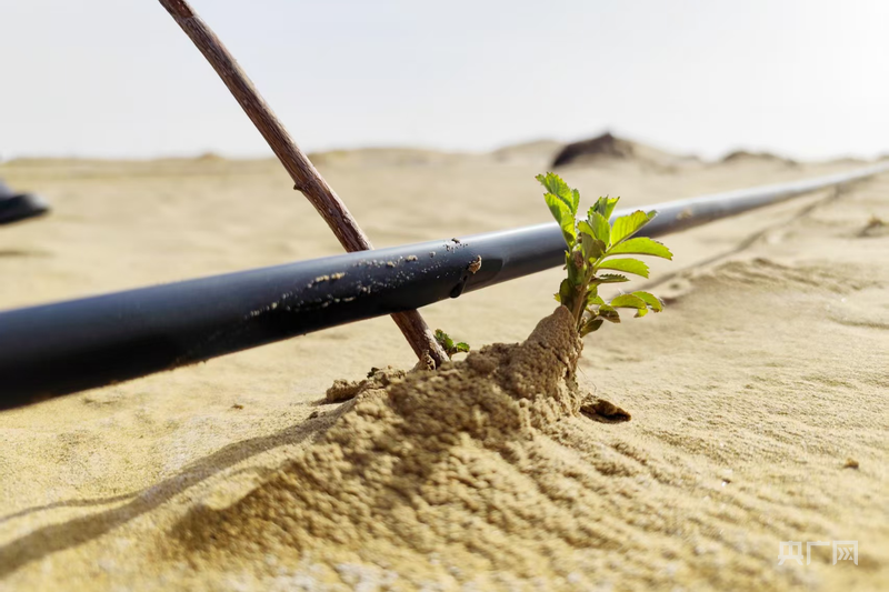 數(shù)臺(tái)推土機(jī)以磅礴之勢(shì)推平連綿沙丘,為綠色的希望開(kāi)辟道路;林草技術(shù)中心的技術(shù)人員與護(hù)林員協(xié)作栽種耐旱中草藥苗,每個(gè)動(dòng)作都飽含著對(duì)這片沙地的期待;去年完成塔克拉瑪干鎖邊合龍的區(qū)域,沙漠玫瑰沖破沙層露出新芽;滴灌帶的水滴有序落下,滋潤(rùn)著這片干涸的沙漠,像一條條生命的脈絡(luò)延伸在廣袤沙海……