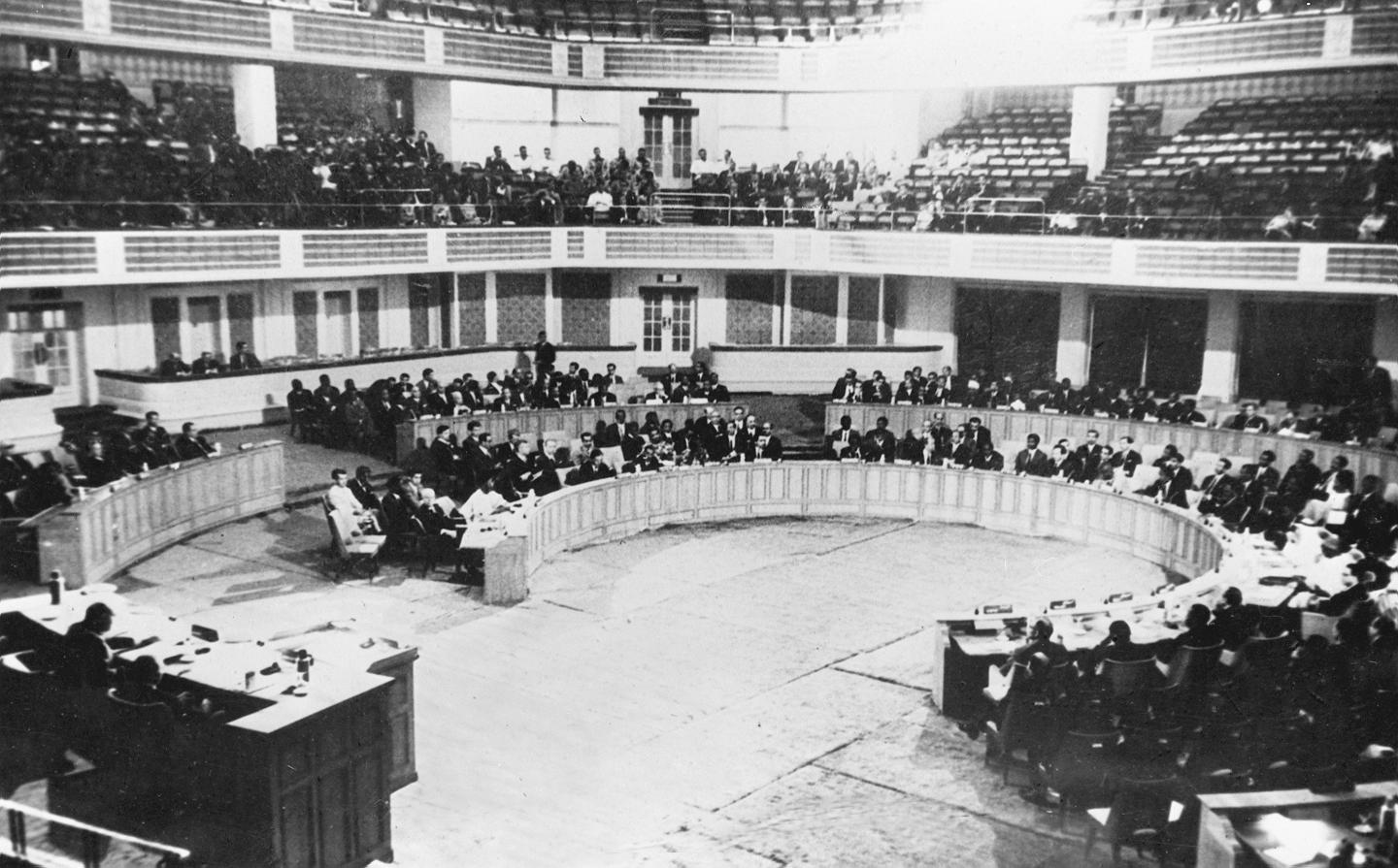 1955年4月18日至24日,29個亞非國家和地區(qū)的政府代表團在印度尼西亞萬隆召開亞非會議。圖為萬隆亞非會議會場內(nèi)景。新華社記者錢嗣杰攝