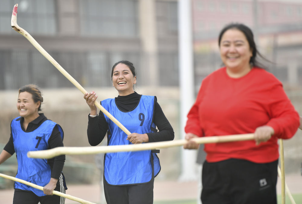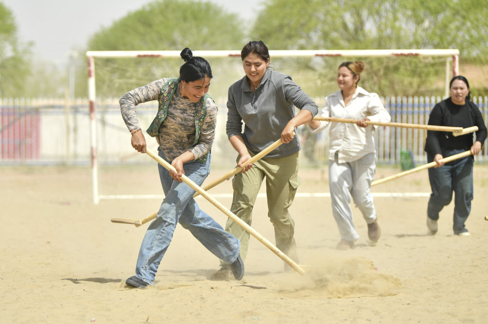 達(dá)里雅布依鄉(xiāng)女子麥熱球隊(duì)的訓(xùn)練場(chǎng)地,就是一片被胡楊、紅柳包圍著的沙地操場(chǎng)。麥熱球類似曲棍球,是一種在新疆和田地區(qū)廣泛流行的古老運(yùn)動(dòng)。這項(xiàng)群眾性運(yùn)動(dòng)并沒(méi)有過(guò)于嚴(yán)格的規(guī)則,一片空地,三五好友,興之所起,即可揮桿。2021年,麥熱球被正式列入國(guó)家級(jí)非物質(zhì)文化遺產(chǎn)代表性項(xiàng)目名錄。