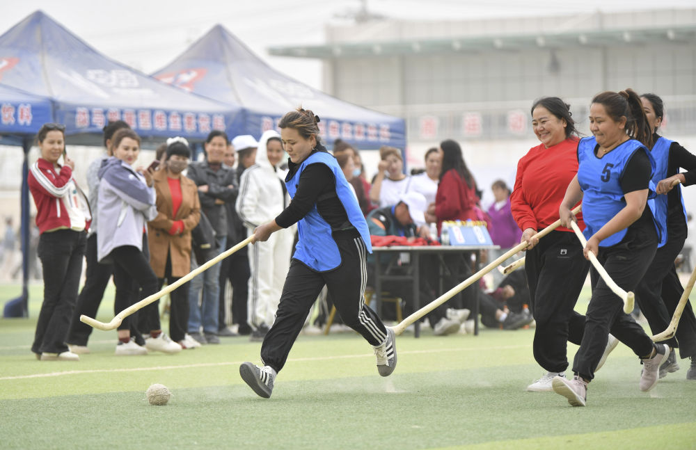 39歲的阿依古麗·買托合提是球隊(duì)里最年長(zhǎng)的隊(duì)員。她身穿皮衣、腳踏休閑鞋,奔跑在正午驕陽(yáng)下,屢屢揮動(dòng)球桿,拼搶也毫不遜色。一起訓(xùn)練的隊(duì)友有人穿著牛仔褲,有人穿著襯衫,還有人穿著后跟略高的鞋子。紅色的球洞穿由兩個(gè)塑料水瓶組成的球門,得分的一方歡呼不已,失球的隊(duì)員則懊惱地擦去臉上的沙塵。