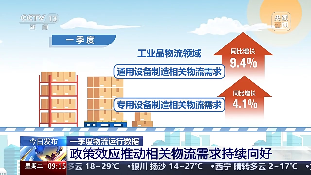 政策效應(yīng)持續(xù)顯現(xiàn),大規(guī)模設(shè)備更新、消費品以舊換新政策推動相關(guān)物流需求持續(xù)向好。一季度,工業(yè)品物流領(lǐng)域的通用設(shè)備、專用設(shè)備制造相關(guān)物流需求,同比分別增長9.4%、4.1%;民生消費領(lǐng)域的通信器材類、家用電器和音像器材類、家具類商品零售相關(guān)物流需求同比分別增長26.9%、19.3%和18.1%。