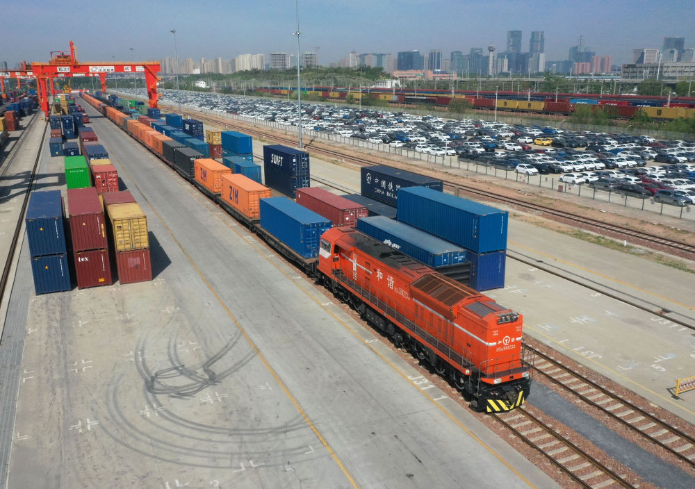 2025年4月15日,X8003次中歐班列(鄭州)??吭趪F集團(tuán)鄭州局圃田車站(無人機照片)。新華社記者 李嘉南 攝
