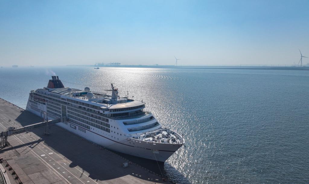 “歐羅巴2”號(hào)郵輪靠泊天津國際郵輪母港(無人機(jī)照片)。新華社記者孫凡越攝