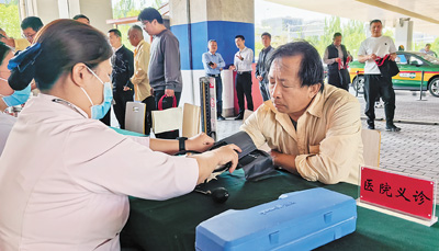 “您這血壓有點高,‘五一’假期活多,別忘了吃藥?!薄坝涀±玻x謝?!?1歲的司機楊建民在門口的義診攤位量完血壓,整理著衣袖。
