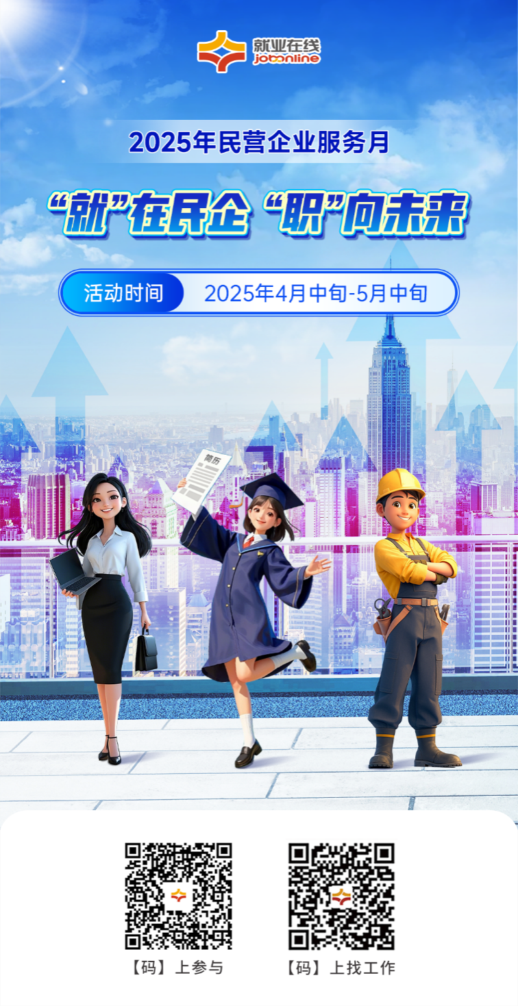 為支持民營經(jīng)濟發(fā)展,促進(jìn)高質(zhì)量充分就業(yè),按照人力資源社會保障部等6部門關(guān)于開展2025年民營企業(yè)服務(wù)月活動安排,“就業(yè)在線”平臺開展2025年民營企業(yè)服務(wù)月線上招聘求職服務(wù)活動,助力民營企業(yè)招聘用工和廣大勞動者求職就業(yè)。