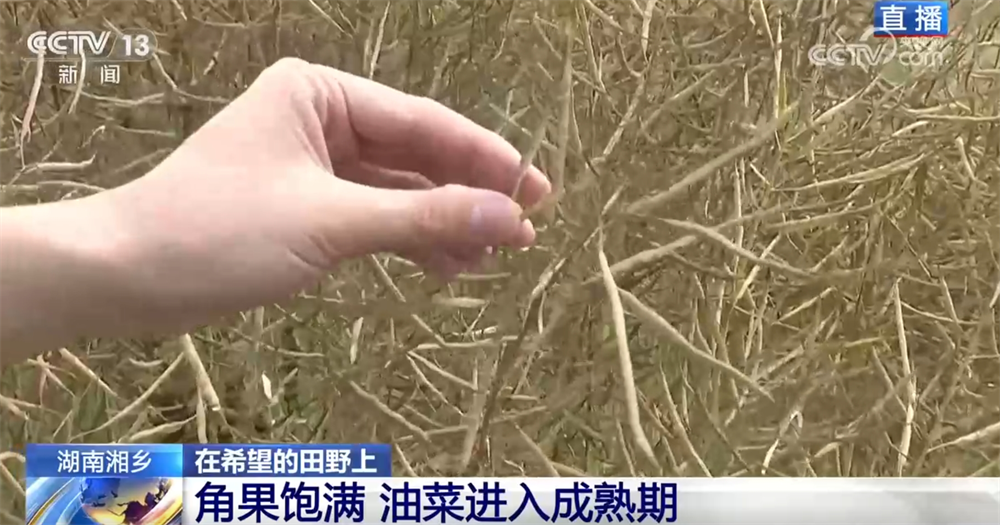記者來到了湘潭湘鄉(xiāng)市泉塘鎮(zhèn)雙江村,油菜現(xiàn)在長(zhǎng)得怎么樣了?油菜的頂端已經(jīng)呈金黃色,角果很飽滿,我們平時(shí)常說的油菜籽就藏在金黃色的角果里,這說明現(xiàn)在油菜已經(jīng)進(jìn)入成熟期了。