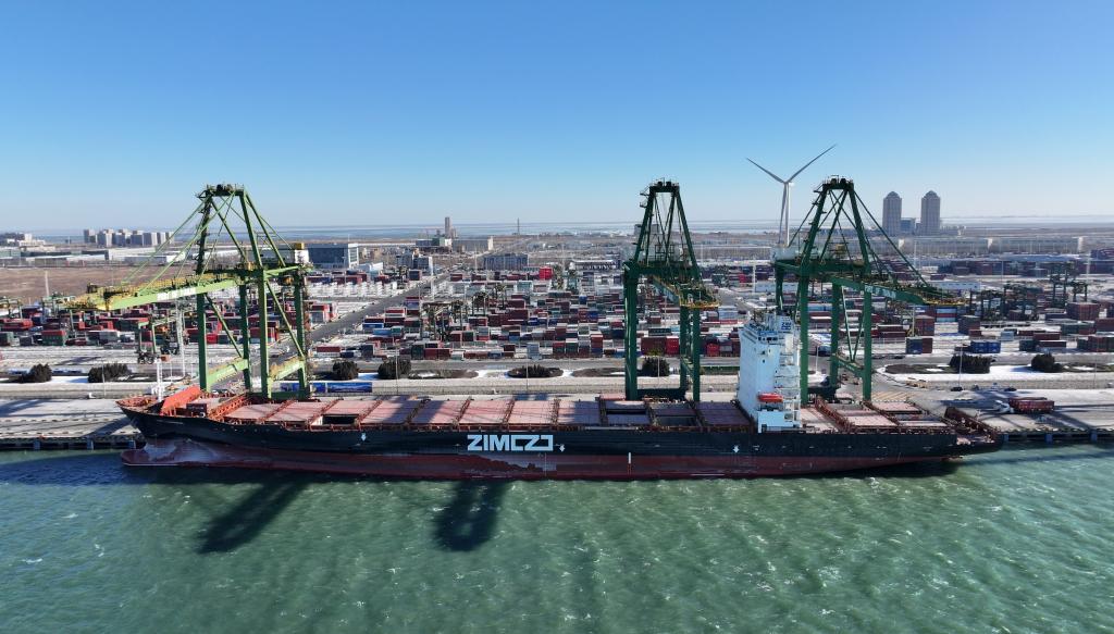 2023年12月21日,“羅安達輪”集裝箱船靠泊在天津港(無人機照片)。當(dāng)日,“羅安達輪”集裝箱船正式從天津港出發(fā),駛向哥倫比亞、厄瓜多爾、秘魯、智利等南美洲國家,標志著天津港正式開通天津—南美西新航線。新華社記者 趙子碩 攝