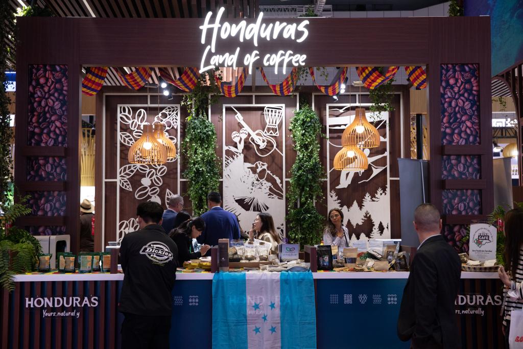 2023年11月6日,參觀者在第六屆進博會國家展洪都拉斯展臺咨詢咖啡豆等展品信息。新華社記者 金立旺 攝