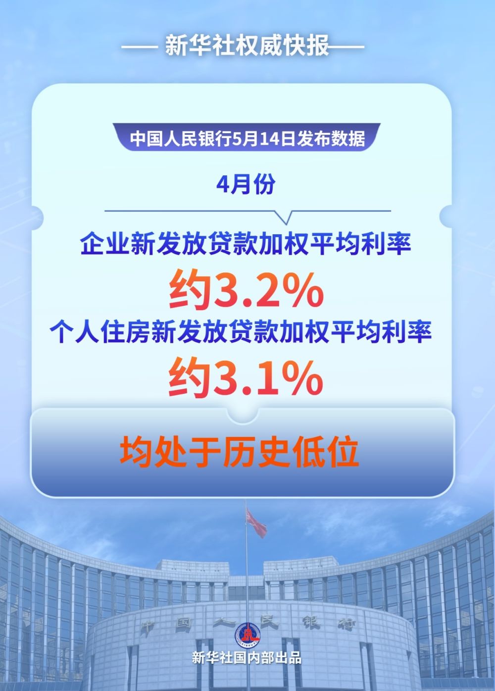 中國(guó)人民銀行的數(shù)據(jù)顯示,4月份,企業(yè)新發(fā)放貸款加權(quán)平均利率約3.2%,比上年同期低約50個(gè)基點(diǎn);個(gè)人住房新發(fā)放貸款加權(quán)平均利率約3.1%,比上年同期低約55個(gè)基點(diǎn),均處于歷史低位。