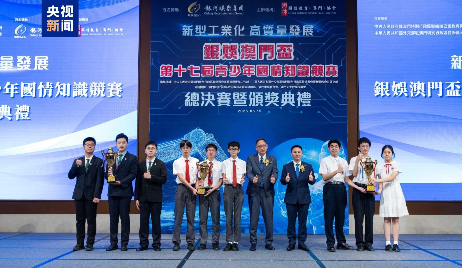 澳門(mén)第十七屆青少年國(guó)情知識(shí)競(jìng)賽總決賽暨頒獎(jiǎng)典禮15日舉行。本屆賽事共吸引了澳門(mén)26所中學(xué)和8所高等院校逾15000名學(xué)生踴躍參與,規(guī)模再創(chuàng)新高。培道中學(xué)、鏡平學(xué)校和澳門(mén)理工大學(xué)分別奪得兩個(gè)中學(xué)組和一個(gè)大學(xué)組冠軍。