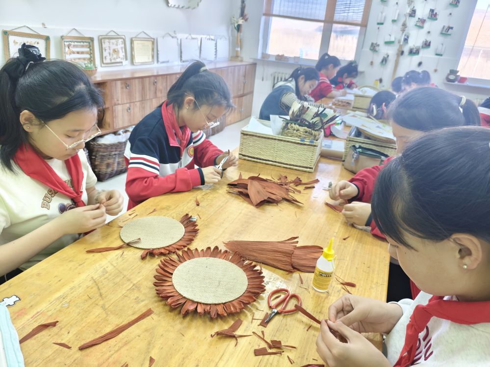 內(nèi)蒙古林西縣統(tǒng)部小學的學生正在制作玉米皮粘貼畫。(受訪者供圖)