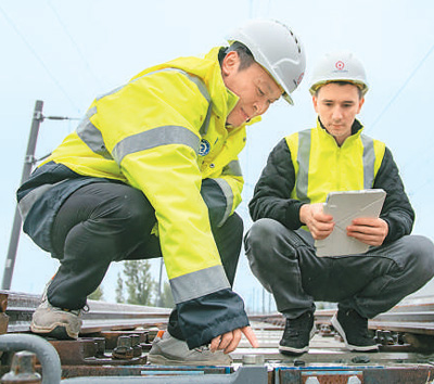 在塞爾維亞諾維薩德的匈塞鐵路塞爾維亞段項(xiàng)目部營地,中國員工段偉(左)與外籍員工一起檢查軌道施工情況。