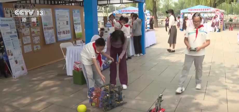 “科技強國”小學(xué)生社團風(fēng)采展示活動也在現(xiàn)場同步開展。來自北京各個學(xué)校的少先隊科技社團齊聚一堂,孩子們興致盎然地分享自己設(shè)計拼裝的投球機器人、巡防機器人、智能消毒碗柜等精彩紛呈的科技成果。