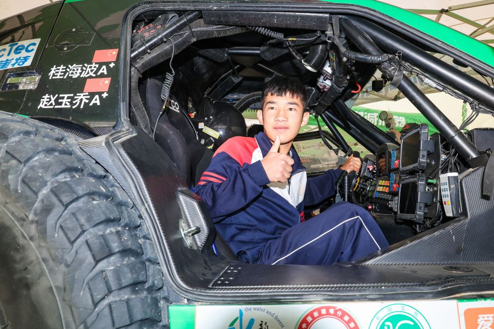 2025年5月31日,新疆喀什地區(qū)麥蓋提縣的中學生在環(huán)塔營地參觀時與賽車合影。新華社發(fā)(環(huán)塔組委會供圖)
