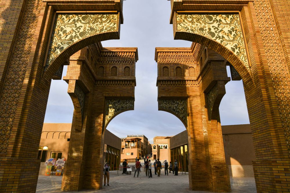 游客在新疆喀什高臺民居歷史文化街區(qū)游玩(2023年6月14日攝)。大門上方的裝飾圖案和文字源自出土于新疆的文物——“五星出東方利中國”織錦。新華社記者 胡虎虎 攝