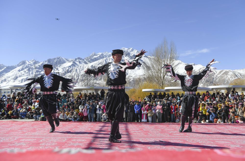 在新疆塔什庫爾干塔吉克自治縣“彩云人家”民俗村,演員為觀眾表演國家級非物質文化遺產(chǎn)——鷹舞(2025年3月22日攝)。新華社記者 胡虎虎 攝