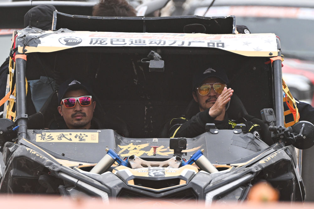 ↑6月1日,駕長車隊車手吳京(右)、領航員梁冬冬在賽后參加收車儀式。新華社記者 辛悅衛(wèi) 攝