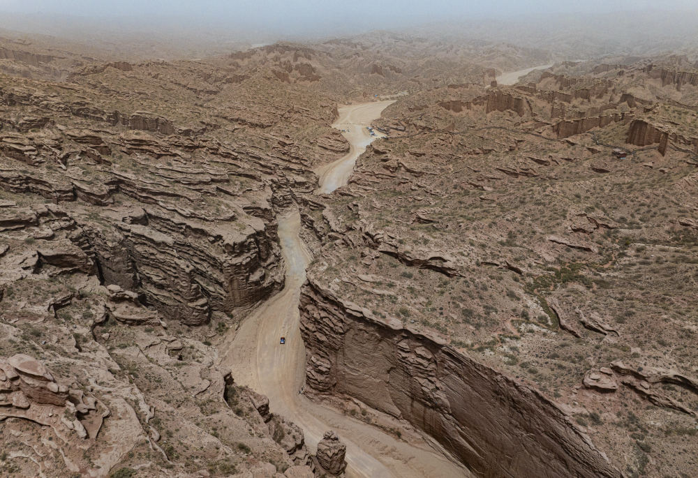 ↑5月21日,賽車行駛在第一賽段賽道上(無人機照片)