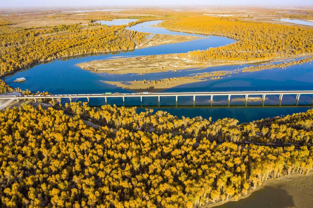 沿途穿越多片胡楊林,風景壯麗。新華社記者 胡星宇 攝