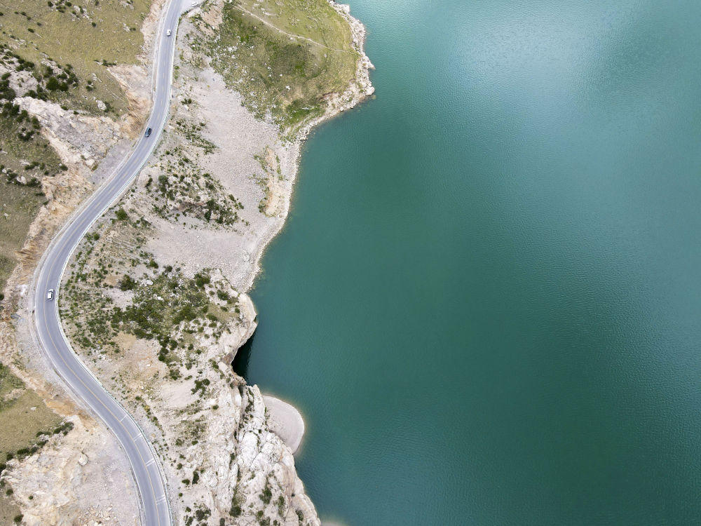 ↑這是2021年6月20日拍攝的車輛行駛在新疆獨庫公路上(無人機照片)