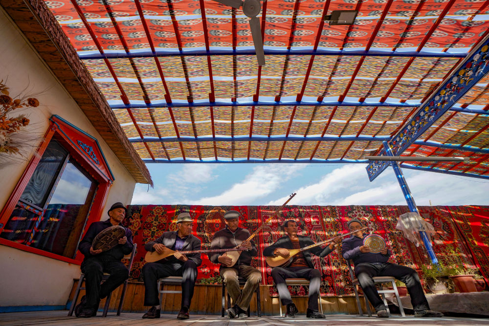 非遺傳承人努爾東·司馬義(左二)和村民在院子里演奏(2024年10月30日攝)