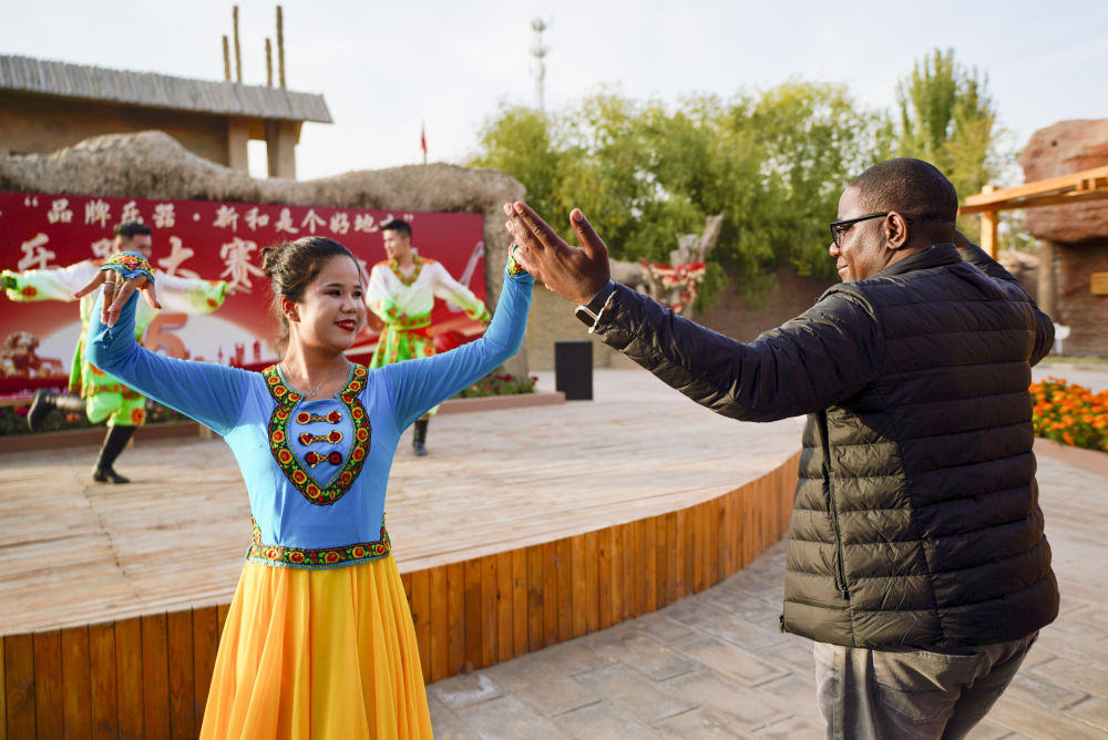 2023年環(huán)塔拉力賽參賽代表參加旅游展示活動。新華社記者 胡虎虎 攝