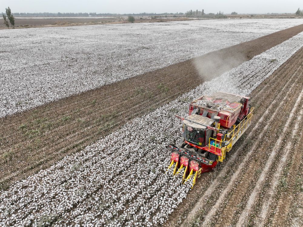 ↑2024年10月24日,在新疆阿克蘇地區(qū)阿瓦提縣,一臺大型采棉機在棉田里作業(yè)(無人機拍攝)。新華社記者 高晗 攝