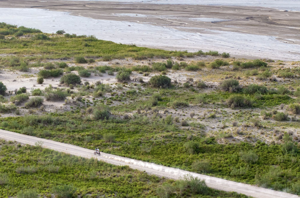 ↑5月26日,一輛摩托車行駛在第五賽段賽道上(無人機照片)