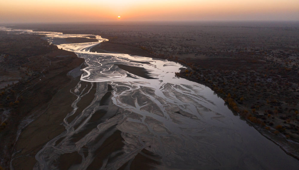 ↑這是在塔克拉瑪干沙漠腹地拍攝的新疆于田克里雅河國家濕地公園(2019年11月10日攝,無人機照片)。新華社記者 胡虎虎 攝