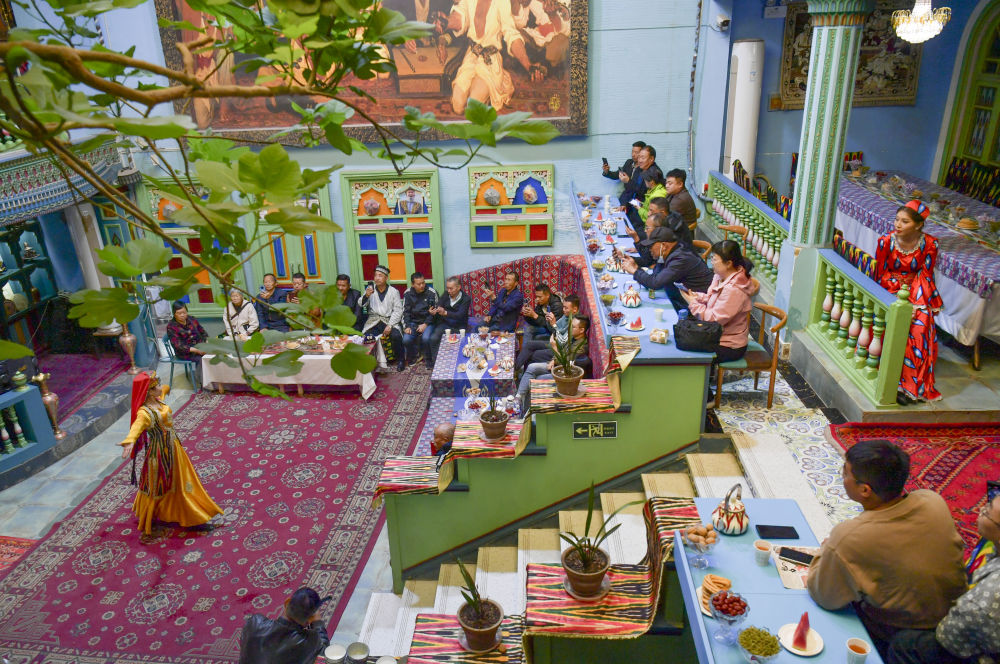 ↑游客在新疆喀什古城景區(qū)的一家民宿內(nèi)欣賞歌舞表演(2024年4月29日攝)。新華社記者 王菲 攝