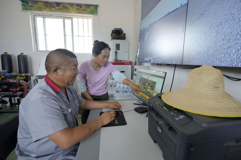 在山西省運(yùn)城市鹽湖區(qū)解州鎮(zhèn)曲村,董會龍(左)和妻子范月親通過農(nóng)機(jī)精準(zhǔn)作業(yè)平臺查看農(nóng)機(jī)手作業(yè)情況。董會龍夫妻是運(yùn)城市鹽湖區(qū)解州鎮(zhèn)的種糧大戶。(5月27日攝)。