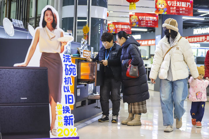 2025年1月8日,顧客在山東省青島市李滄區(qū)李村街道一家商場選購洗碗機。新華社發(fā)(張鷹 攝)