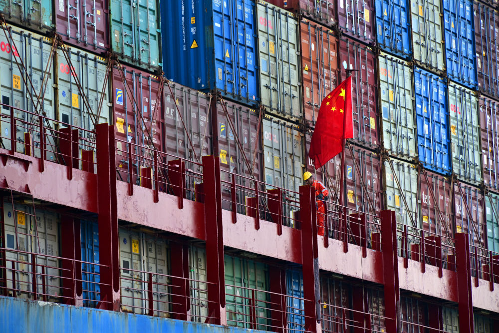 4月30日,工人在“中遠新寧波”輪船尾進行貨柜堆放安全檢查。新華社記者 李紫恒 攝