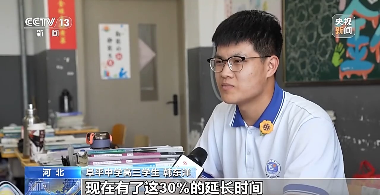阜平中學(xué)高三學(xué)生 韓東洋:正常人他們寫300字左右,我大概才能寫200多字,就比如說(shuō)語(yǔ)文,平常模擬考試的時(shí)候,大概還有個(gè)二三百或三四百字就寫不完,現(xiàn)在有了這30%的延長(zhǎng)時(shí)間,心里就比較踏實(shí)了。