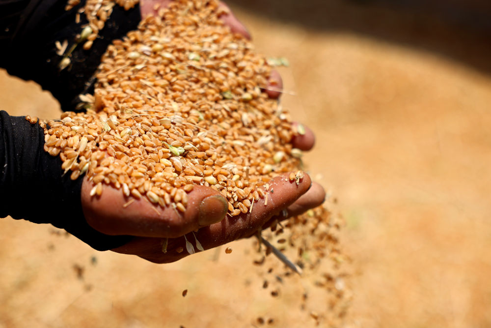5月25日,在山東省棗莊市市中區(qū)稅郭鎮(zhèn)沙溝村麥田,農(nóng)民展示剛剛收獲的小麥。新華社發(fā)(孫中喆攝)