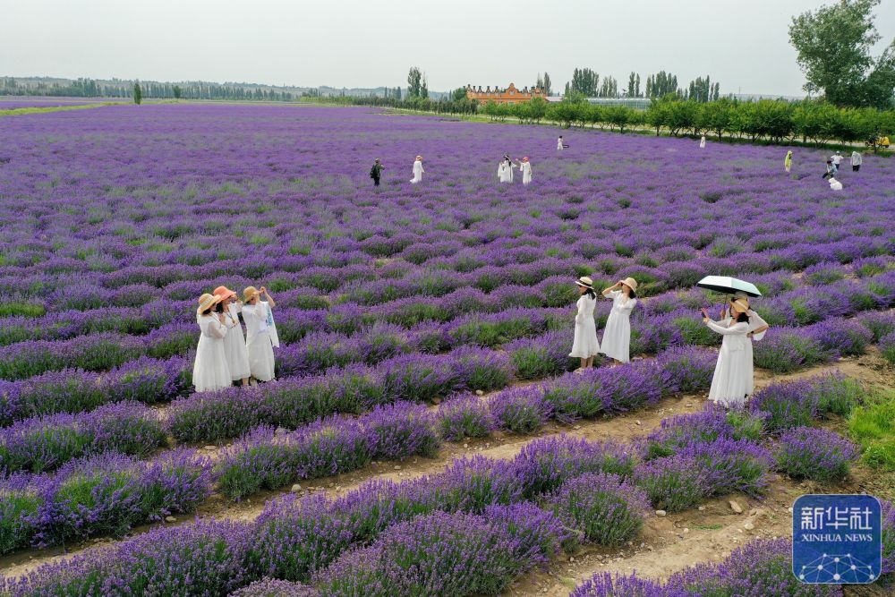 在新疆伊犁哈薩克自治州霍城縣解憂公主薰衣草園,游客在非遺集市游覽拍照(6月14日攝)。
