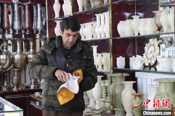 皮亞爾·卡里姆在店里擦拭玉器。(資料圖)茍繼鵬 攝