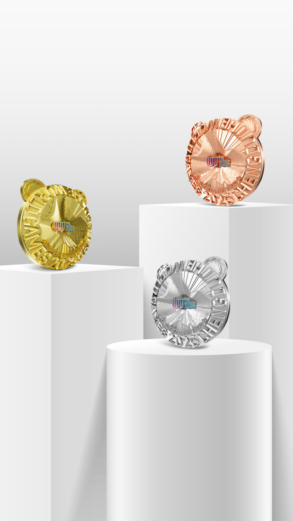 “竹光”獎牌正面居中的是國際世界運動會協(xié)會會徽,賽事中英文名稱環(huán)繞呼應。巧妙融入的太陽神鳥紋飾,與暗合城市輪廓的流動凹凸線條,在底部營造出層層光芒,既彰顯中華文明、巴蜀文化的璀璨歷史,更象征著運動精神永恒閃耀。