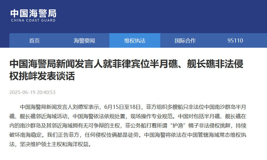 中國海警局新聞發(fā)言人劉德軍表示,6月15日至18日,菲方組織多艘船只非法位中國南沙群島半月礁、艦長礁鄰近海域活動,中國海警依法依規(guī)處置,現(xiàn)場操作專業(yè)規(guī)范。中國對包括半月礁、艦長礁在內(nèi)的南沙群島及其鄰近海域擁有無可爭辯的主權(quán),菲公務(wù)船打著所謂“護(hù)漁”幌子非法侵權(quán)挑釁,持續(xù)破壞南海穩(wěn)定。我們正告菲方,任何侵權(quán)伎倆都是徒勞。中國海警將依法在中國管轄海域常態(tài)維權(quán)執(zhí)法,堅(jiān)決維護(hù)領(lǐng)土主權(quán)和海洋權(quán)益。